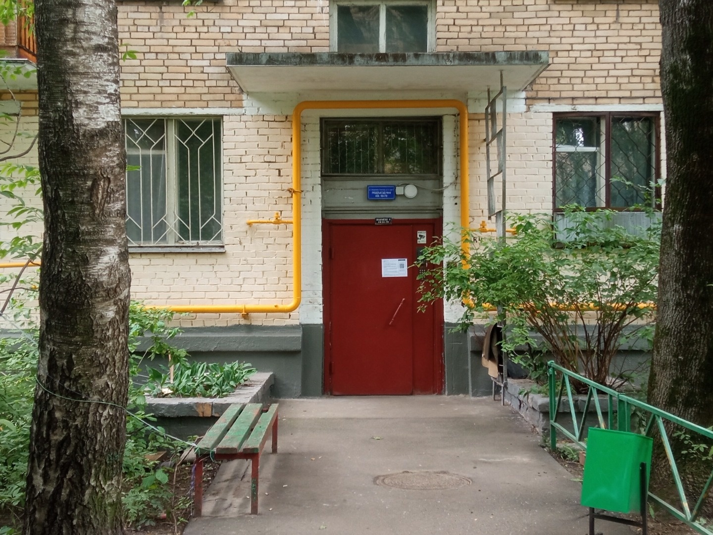 Во дворе детские и спортивный площадки. Высажены деревья, цветы и кустарники.