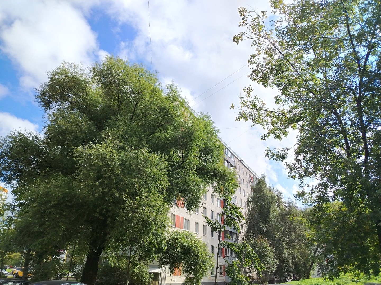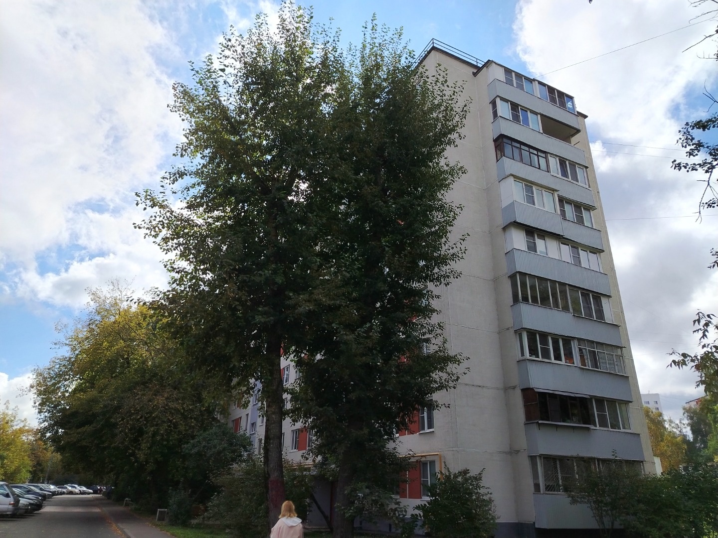 Во дворе дома детские и спортивные площадки. Высажены деревья, цветы и кустарники.