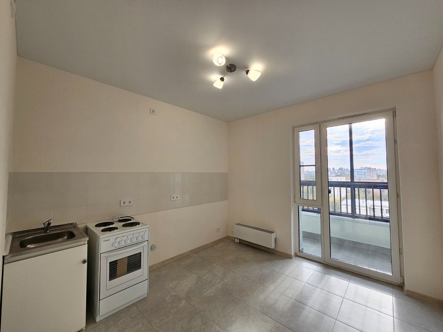 Кухня: фартук из керамической плитки, электроплита, тумба с мойкой
